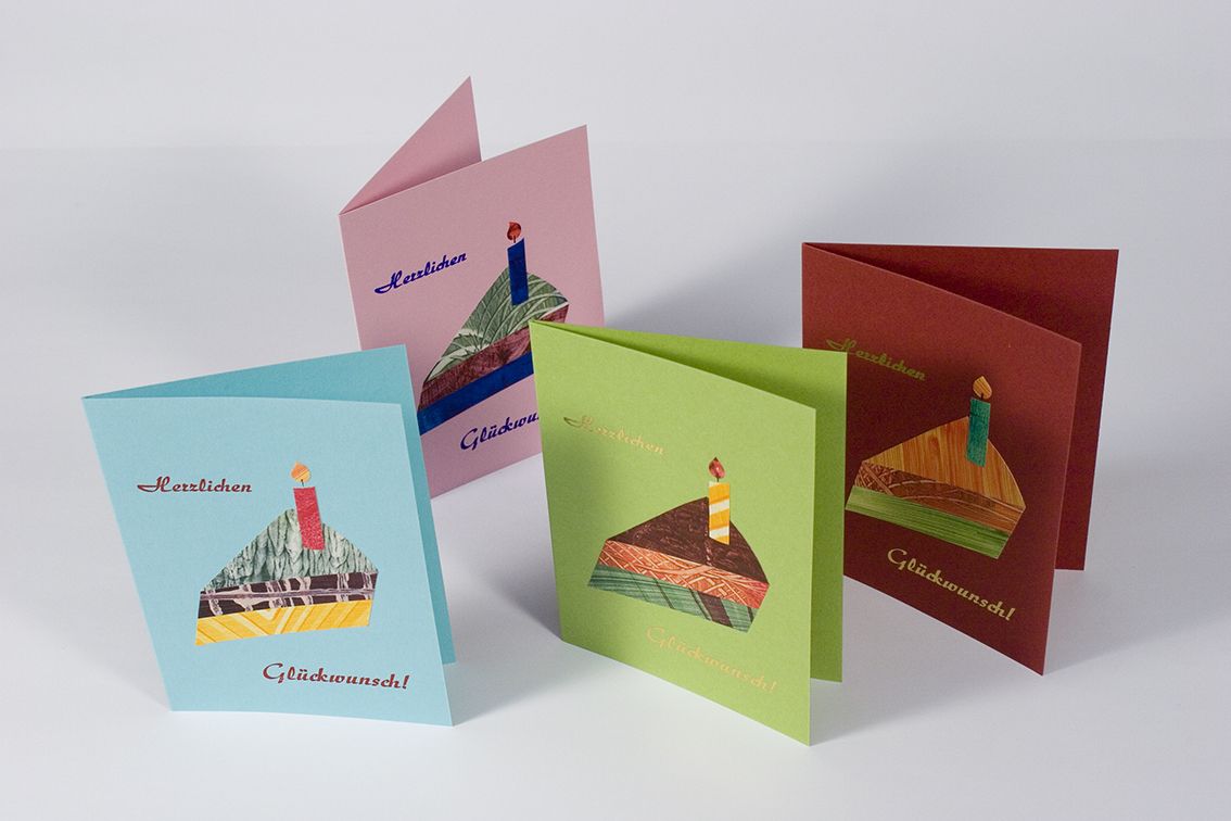 Eine Glückwunschkarte für Geburtstage und andere Feierlichkeiten. Die wie im Patchwork kombinierten handgefärbten Papiere, machen jede Karte einzigartig. Gerne können Sie bei Bestellung einen Farbwunsch angeben, oder einmal vorbei kommen und sich die schönsten Exemplare aussuchen.