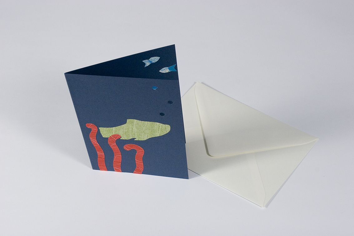 Ein mit handgefärbtem Papier gestalteter Unterwassergruß. Ob zum Geburtstag, zur Geburt oder einfach mal so, eine schöne Karte macht Freude. Gerne können Sie bei Bestellung einen Farbwunsch angeben, oder einmal vorbei kommen und sich die schönsten Exemplare aussuchen.